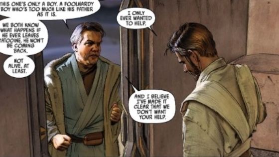 There’s a lot to hint about Owen Lars’ thoughts on Obi-Wan Kenobi. ANH has him dismissing the man when Luke talks about him. The comic books featuring him having crossed words with Kenobi. There is also the slight hint of dislike in ROTS when Aunt Beru greets Obi-Wan when he brings baby Luke. Owen stands away looking off at the twin suns of Tatooine.